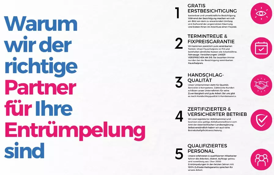 Bei uns erhalten Sie professionelle Entrümpelungsservices zu transparenten und wettbewerbsfähigen Preisen. Kontaktieren Sie uns noch heute, um weitere Informationen zu erhalten und ein maßgeschneidertes Angebot für Ihre Entrümpelung zu erhalten.