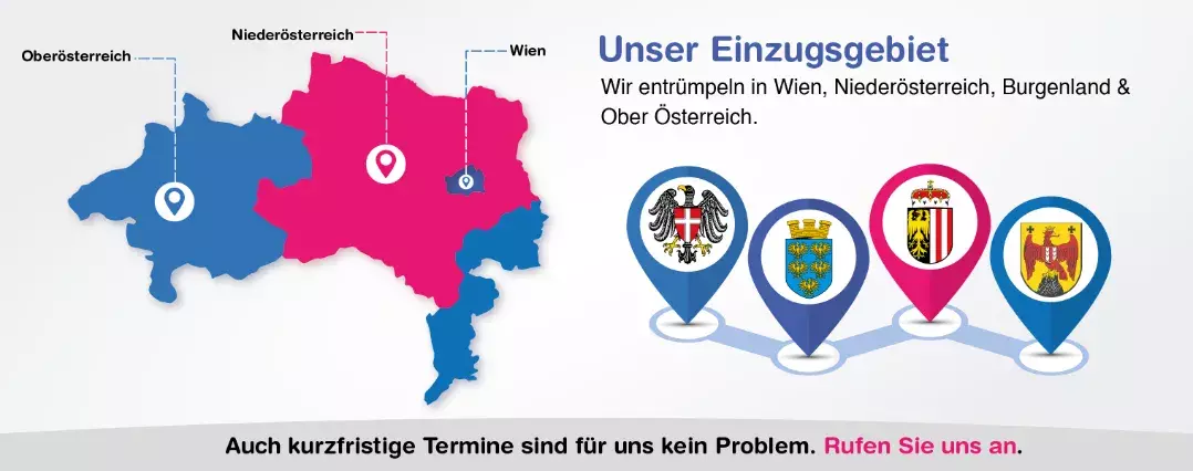 Unser Unternehmen bietet Wohnungsauflösungsdienstleistungen im gesamten Raum Wien und den umliegenden Orten an. Wir sind in allen Stadtteilen von Wien verfügbar, einschließlich der Inneren Stadt, Leopoldstadt, Margareten, Wieden, Mariahilf, Neubau, Josefstadt, Alsergrund, Währing, Döbling, Hernals, Ottakring, Penzing, Hietzing, Liesing sowie Donaustadt und Floridsdorf.